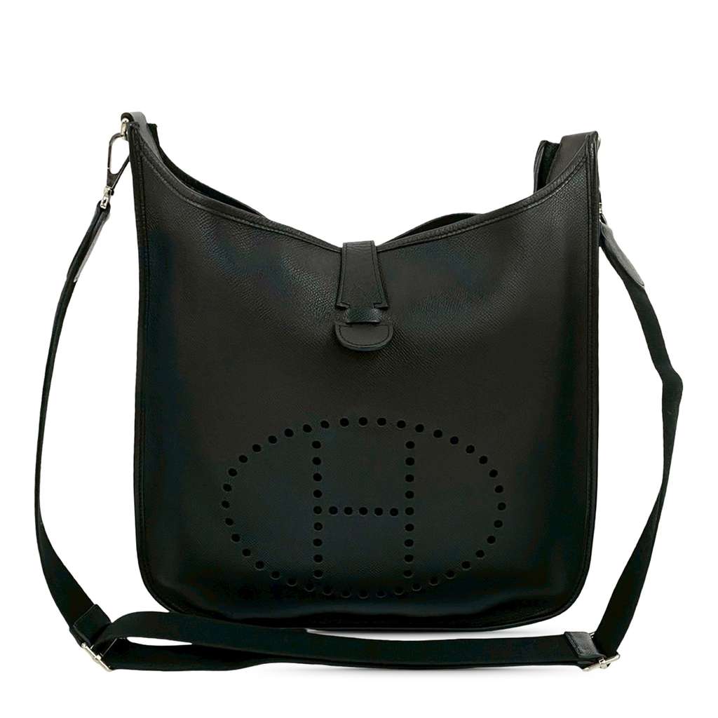 This Evelyne III features a Clemence leather body in Noir color, a detachable and adjustable flat leather strap, an open top with a snap closure, and an exterior back slip pocket.