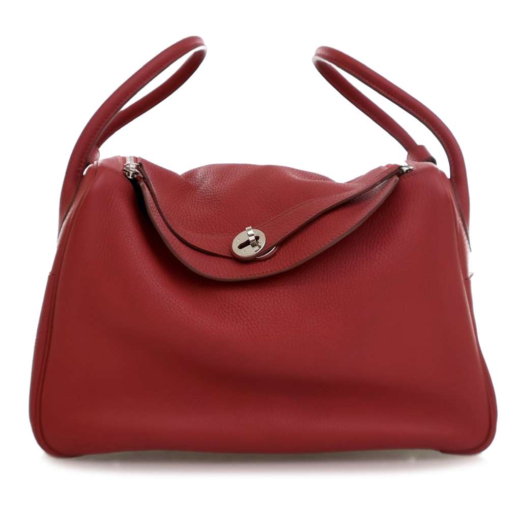 This Lindy features a Clemence leather body in Rouge Garance color, rolled leather handles, a flat leather shoulder strap, and double top zip closures with a top flap and metal turn lock closure.