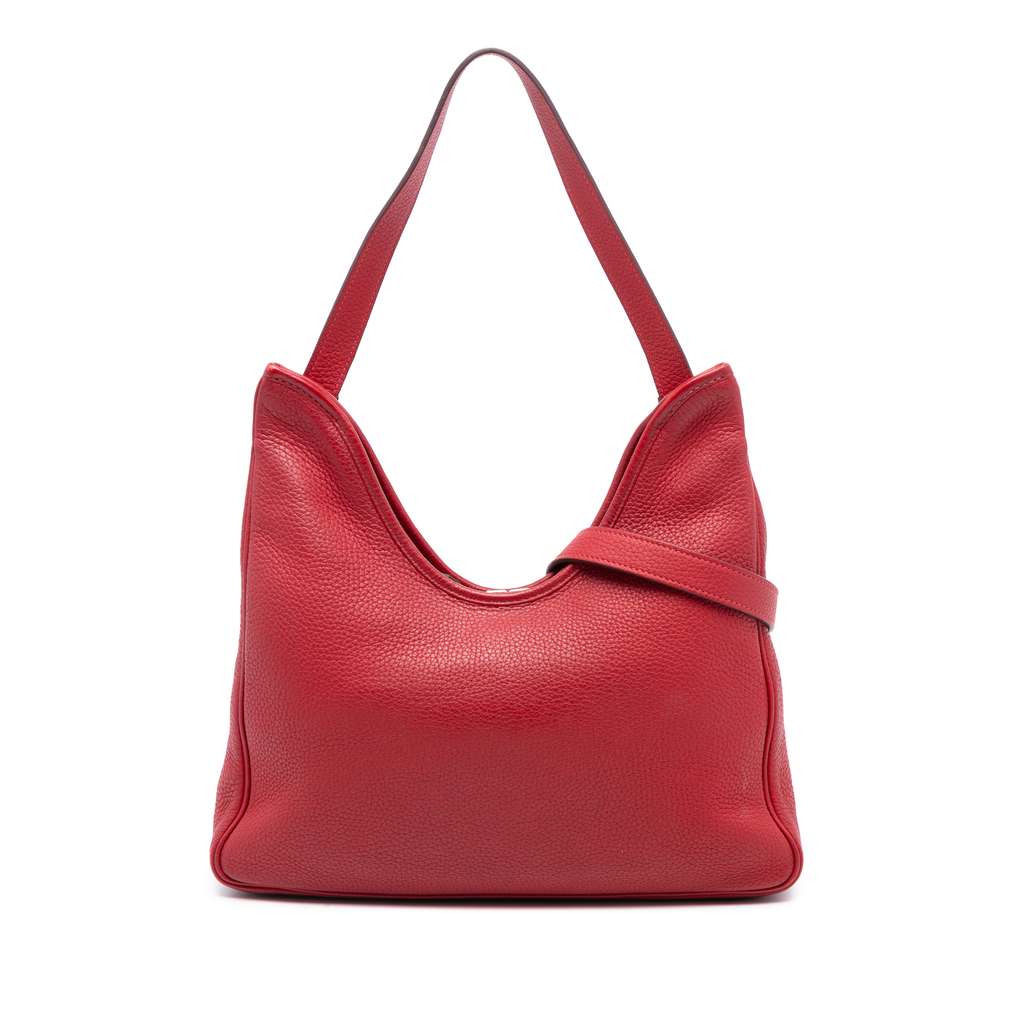This Massai 32 features a Clemence leather body in Rouge Casaque color, a detachable flat short strap, a detachable flat long strap, a top zip closure, and an interior zip pocket.