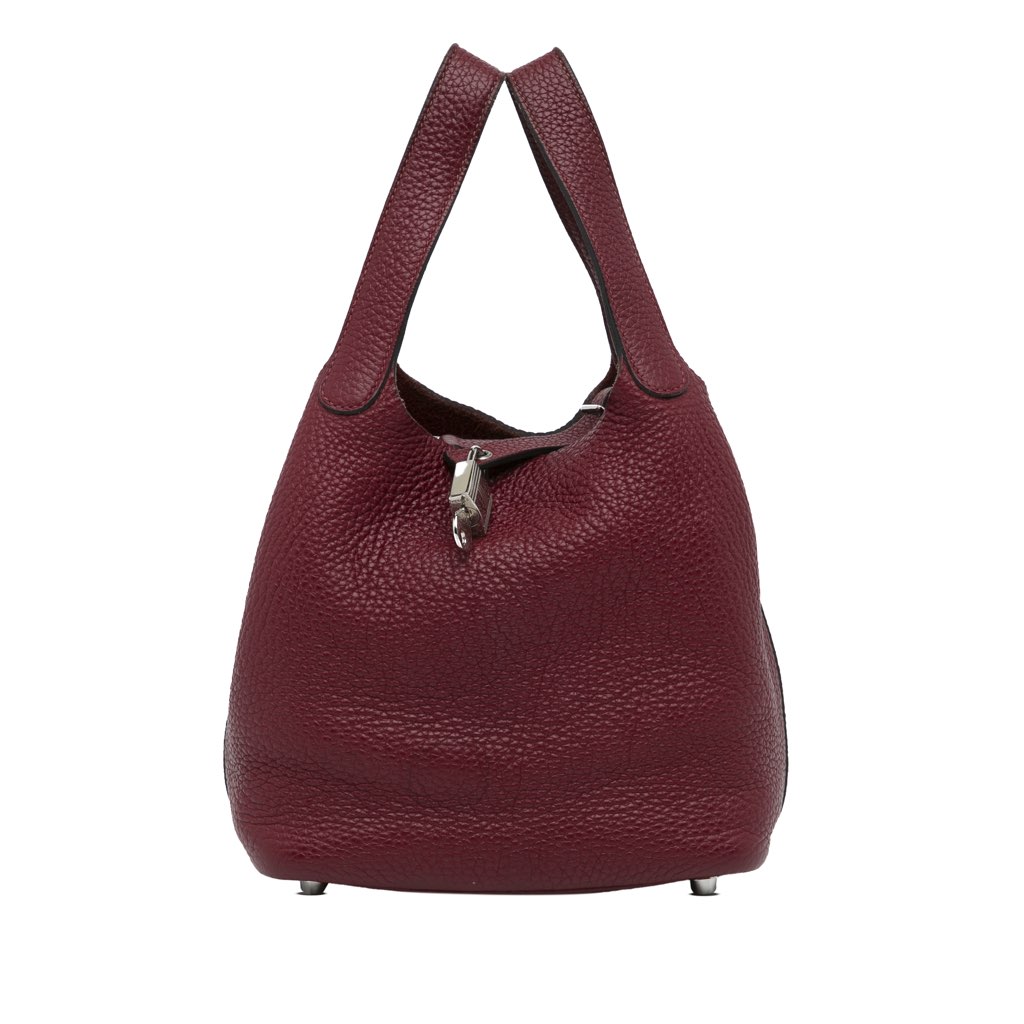 This Clemence Picotin Lock 18 features a Clemence leather body, flat leather handle, and a top pull through strap and lock closure.