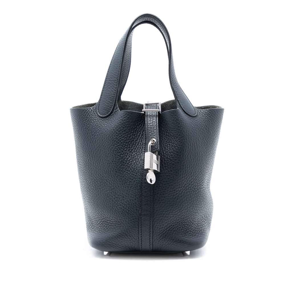 This Picotin Lock features a Clemence leather body in Caban color, flat leather straps, and a top pull through strap and buckle closure.