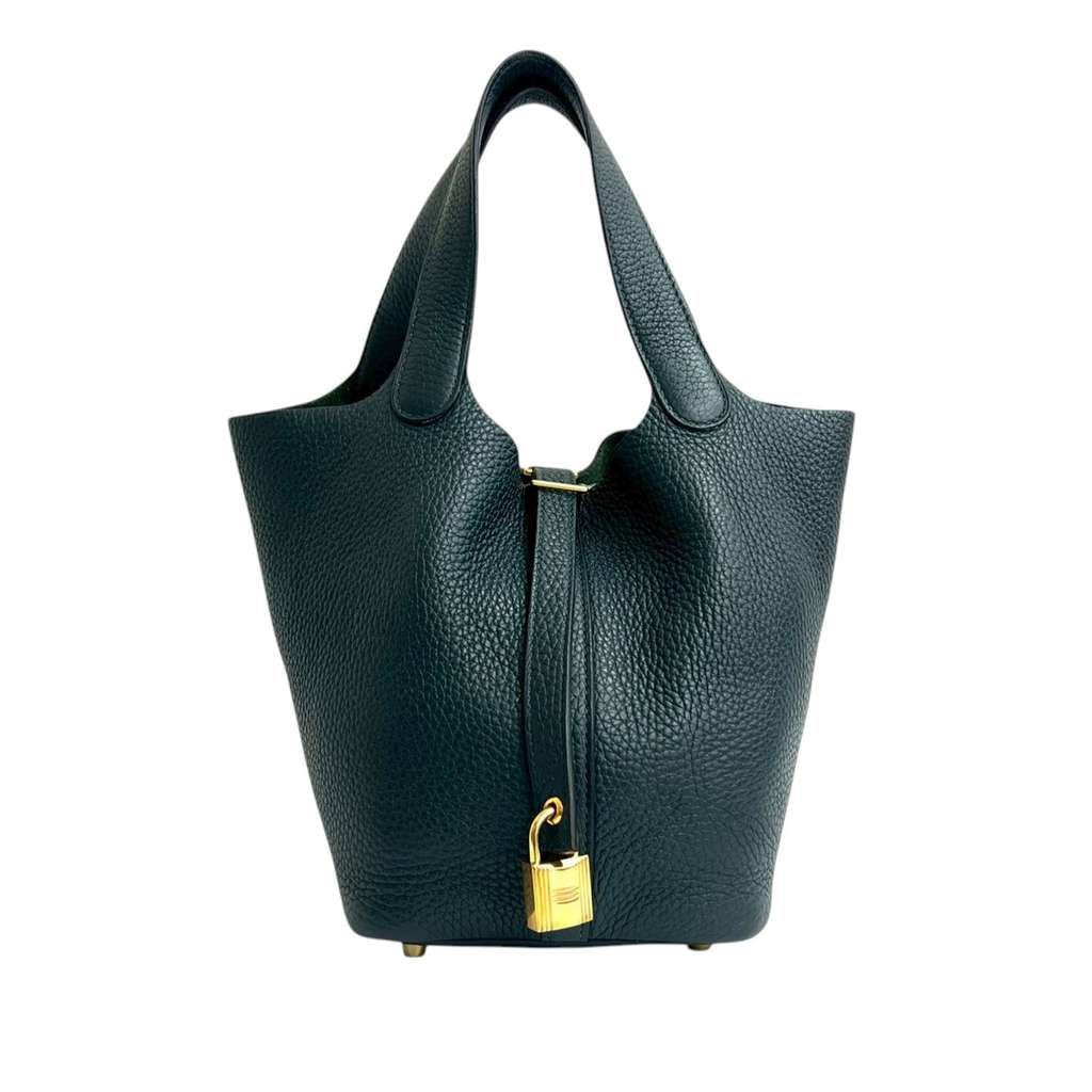 This Picotin Lock 18 features a Clemence leather body in Vert Cypress color, flat leather handles, and an open top with a pull through strap and lock closure.