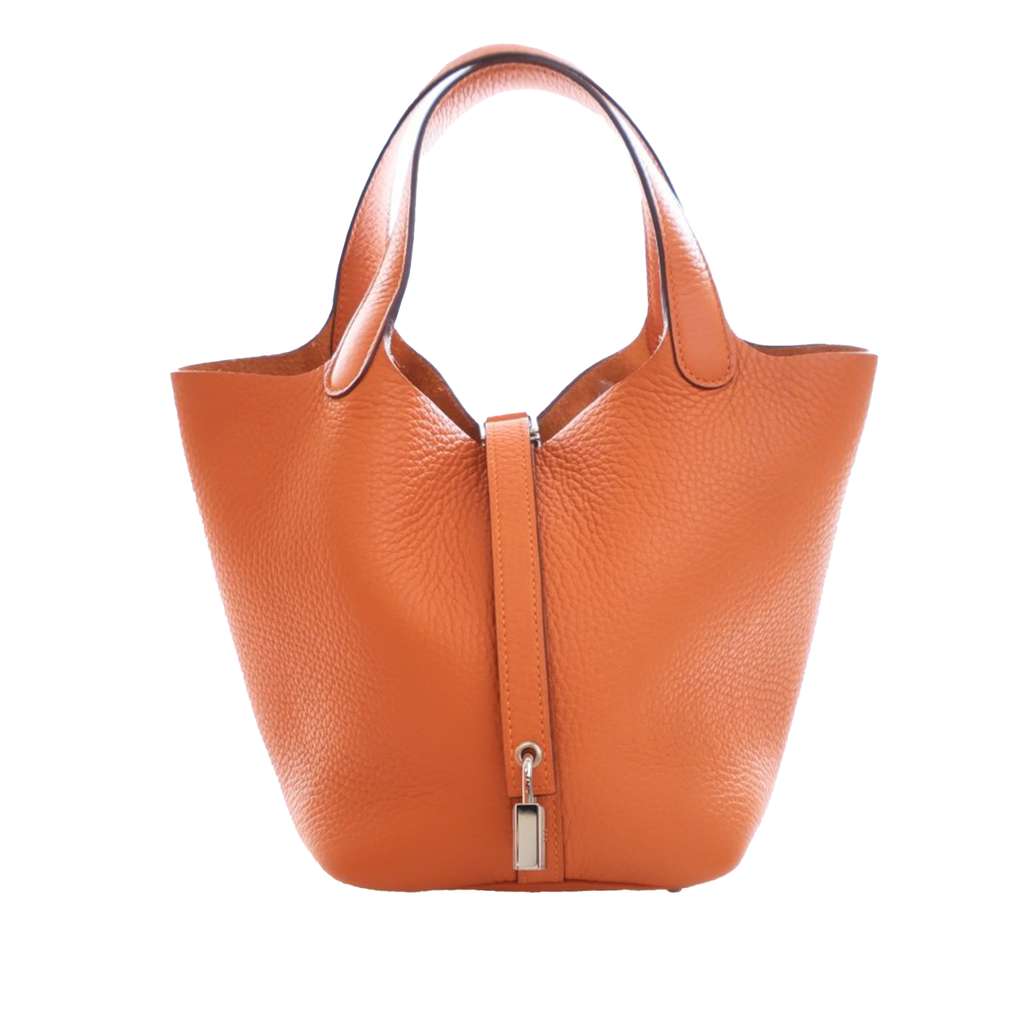 This Picotin Lock features a Clemence leather body in Orange color, flat leather handles, and an open top with a pull-through strap closure.