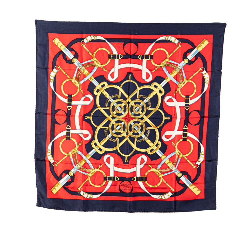 The Eperon d'Or scarf features a print on 100% silk.