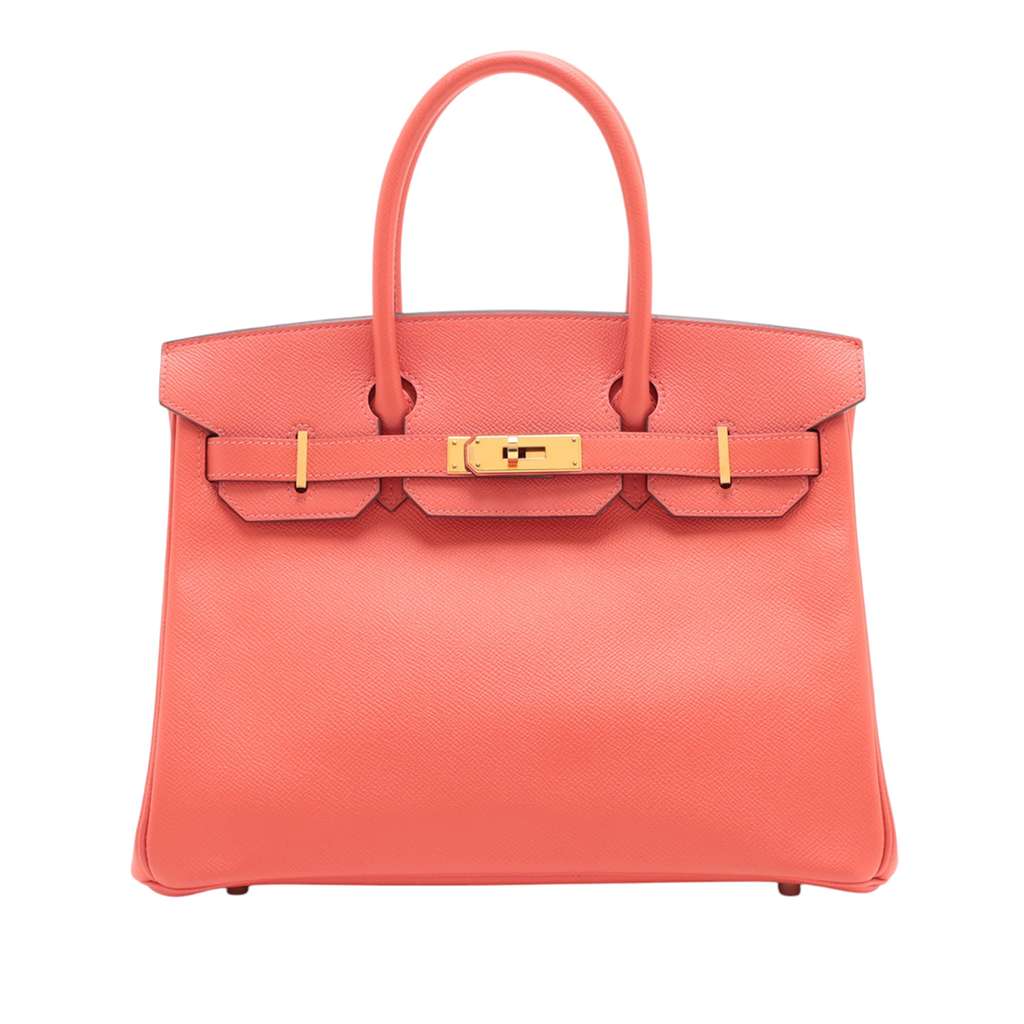 This Birkin 30 features an Epsom leather body in Rouge Pivoine color, rolled leather handles, a front flap with turn lock closure, and interior zip and slip pockets.