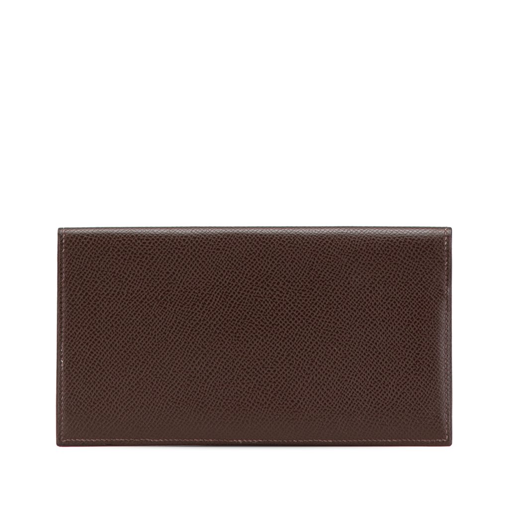 This wallet features an epsom leather body, a front flap, and interior slip pockets.
