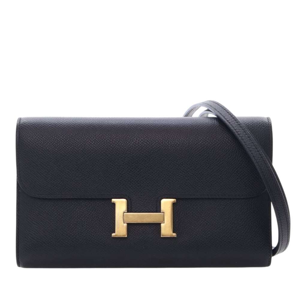 This Constance Long To Go features an Epsom leather body in Noir color, a detachable flat leather strap, a front flap with push lock closure, an exterior back slip pocket, and interior zip and slip pockets.