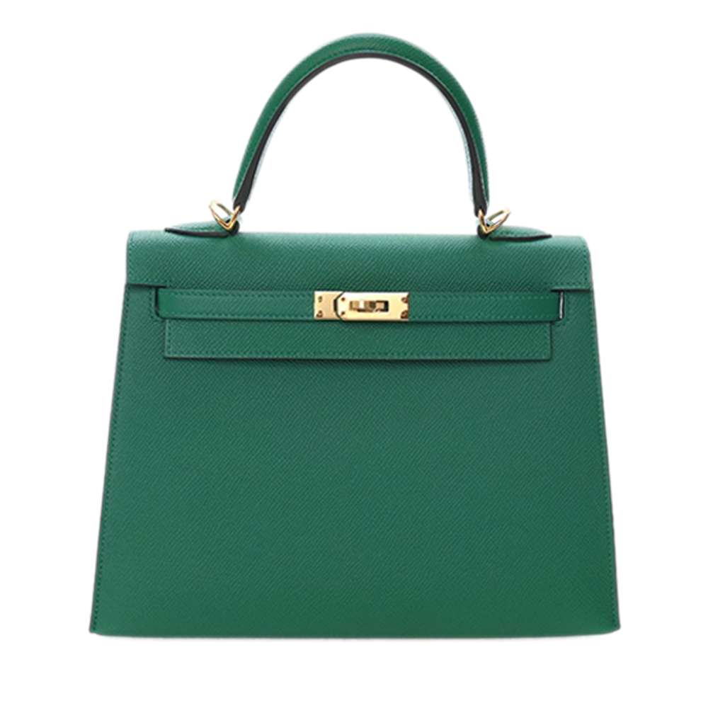 This Kelly 25 features an Epsom leather body in Vert Vertigo color, a rolled leather top handle, a detachable flat leather shoulder strap, a flap with turn lock and pull through closure, and interior zip and slip pockets.