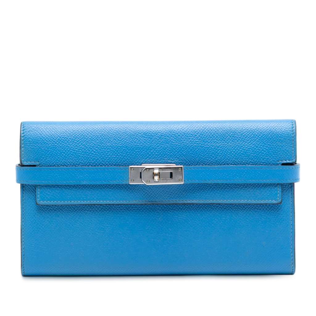 This Kelly wallet features an Epsom leather body in Blue Zanzibar color, a front flap with turn lock closure, and interior zip and slip pockets.