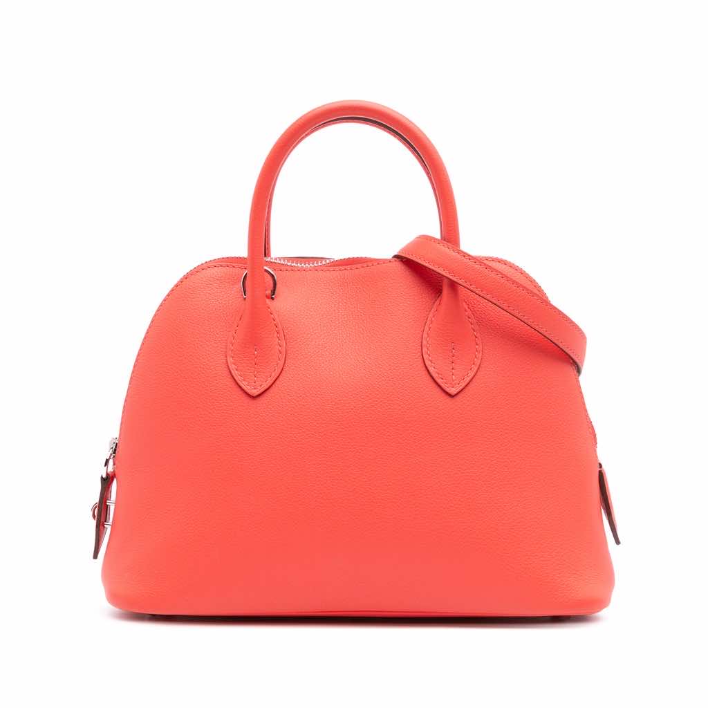 This Bolide 25 features an Evercolor leather body in Rose Texas color, rolled leather handles, a removable flat leather strap, a top zip closure, and interior slip pockets.