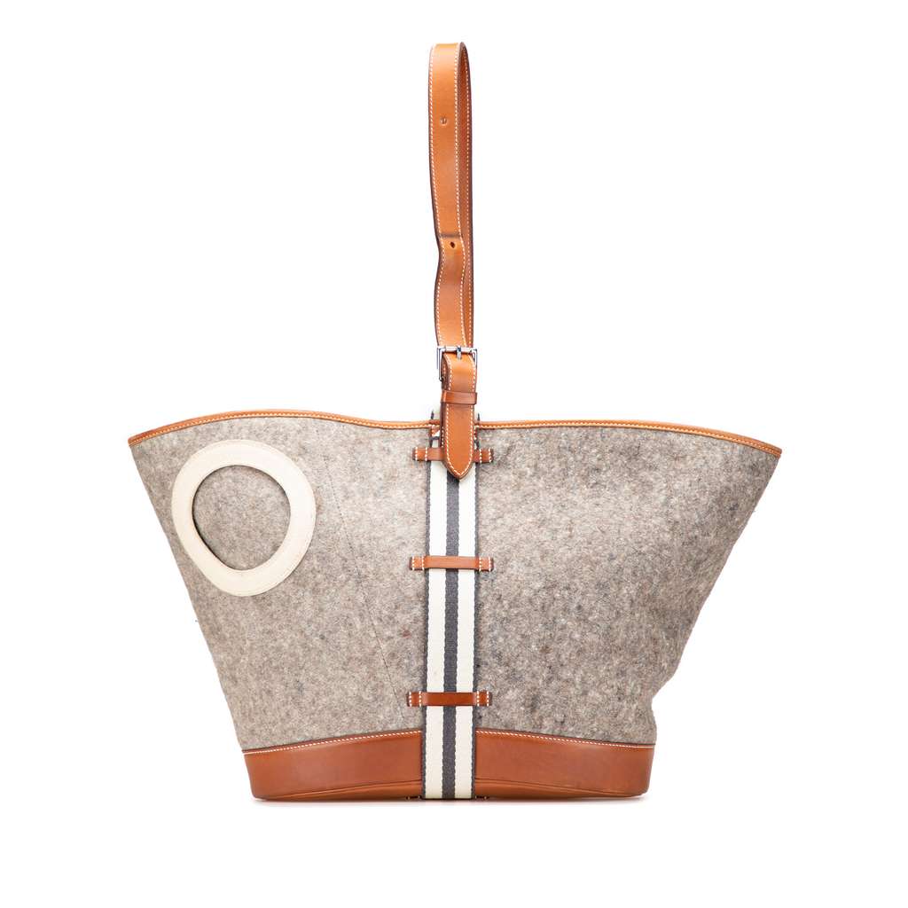 The Camails bucket bag features a felt body with barenia leather trim, a flat leather strap, an open top, and an interior slip pocket.