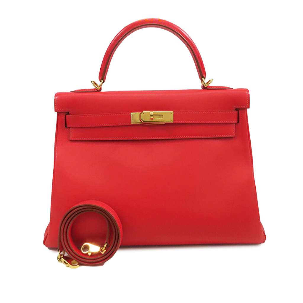 This Kelly 32 features a Gulliver leather body in Rouge Vif color, a flat leather top handle, a detachable flat leather strap, a top flap with twist lock closure, gold hardware, and interior zip and slip pockets.