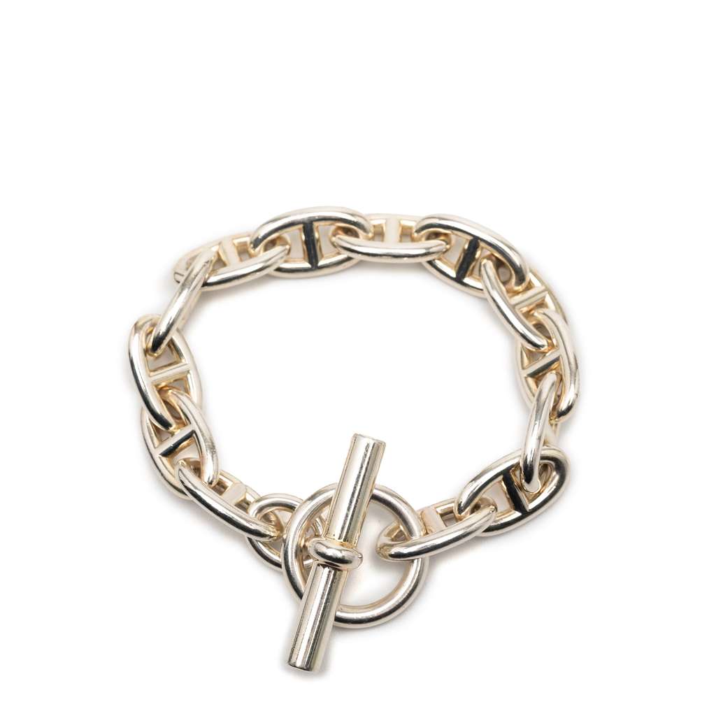 This bracelet features a sterling silver body and a toggle closure.