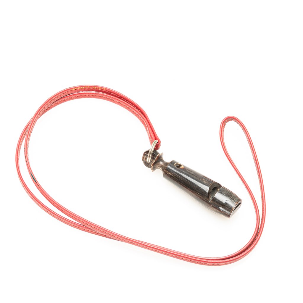 This necklace features a leather strap and a wooden whistle pendant.