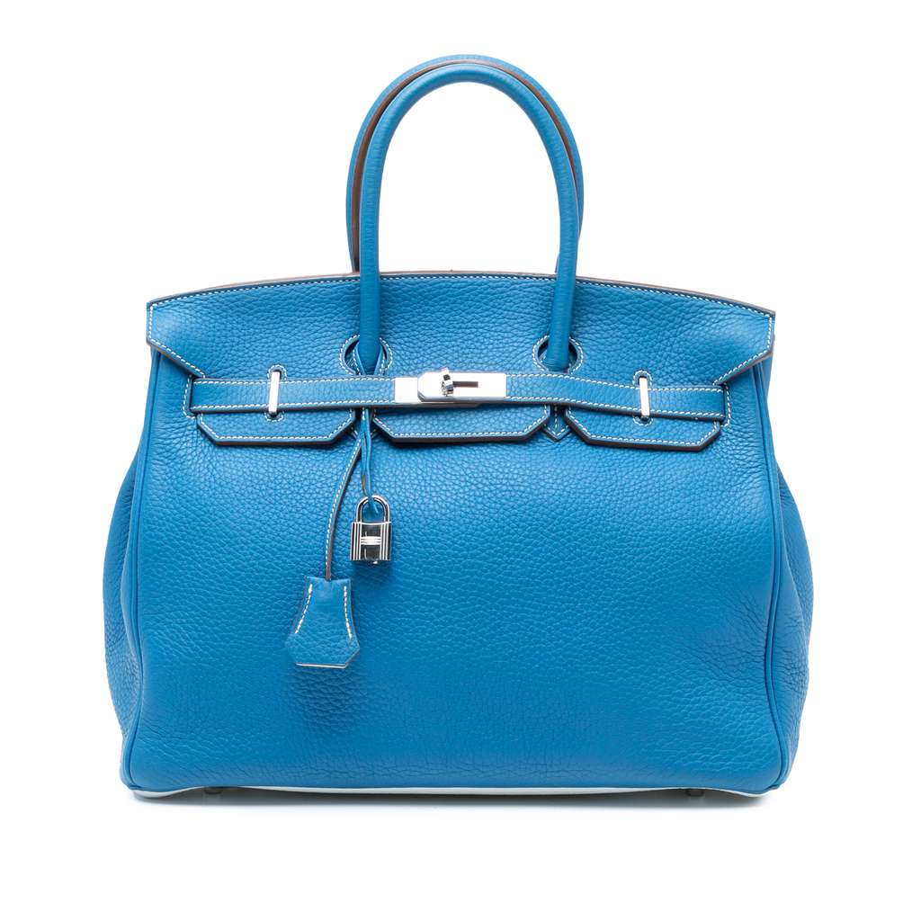 This Birkin 35 features a Clemence leather body in Blue Mykonos and White colors, rolled leather handles, a front flap with a strap and turn lock closure, and interior zip and slip pockets. Exterior bottom is repainted.