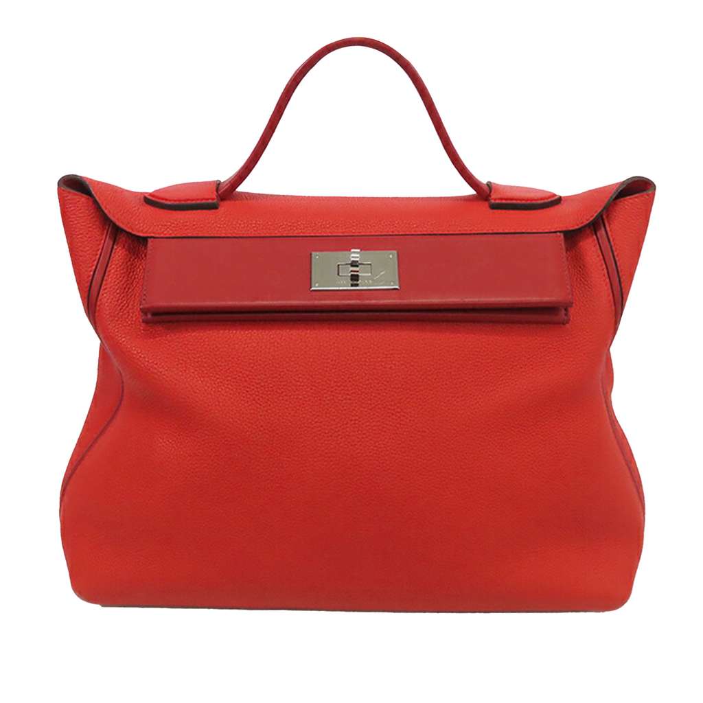 This 24/24 features a Maurice and Swift leather body in Rouge de Coeur and Rouge Piment colors, a flat leather top handle, a top flap with twist lock closure an exterior back slip pocket, and an interior zip pocket.