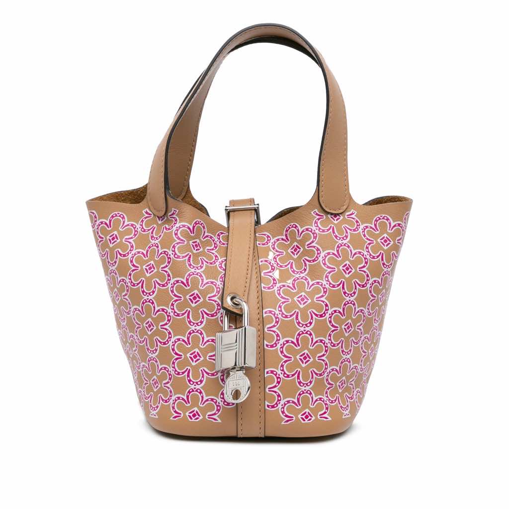 The Picotin Lock features a Swift leather body, flat leather handles, and an open top with strap and buckle closure.