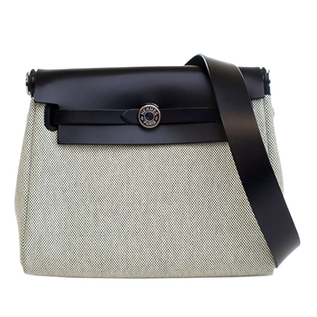 The Herbag features a canvas body, a leather shoulder strap, a top flap with a pull through strap closure, and an exterior back zip pocket.