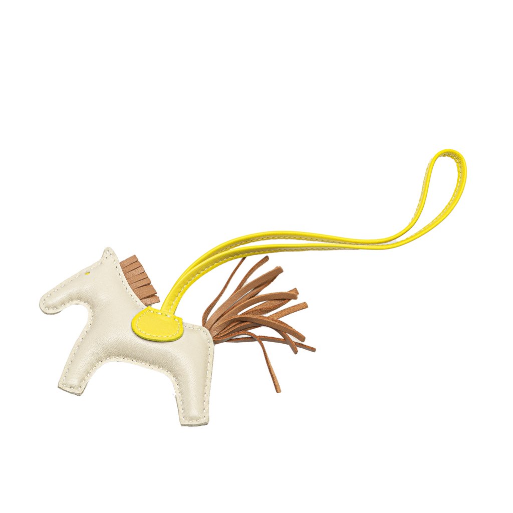 The Rodeo bag charm features a lambskin leather horse charm in Craie, Jaune De Naples, and Gold colors and flat strap.