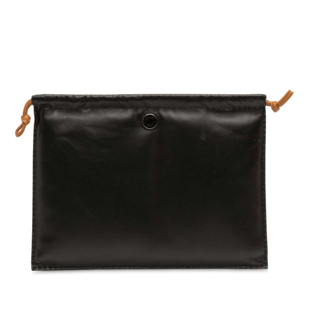 This pouch features a lambskin leather body, a top drawstring closure, and exterior back metal D-rings.