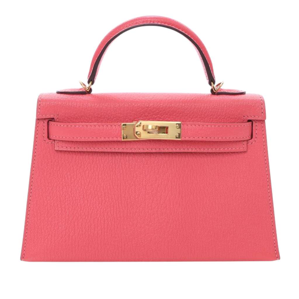 The Mini Kelly features a chevre mysore leather body in Rose Azalee color, a flat leather top handle, a detachable canvas strap, a front flap with twist lock closure, and an interior slip pocket.