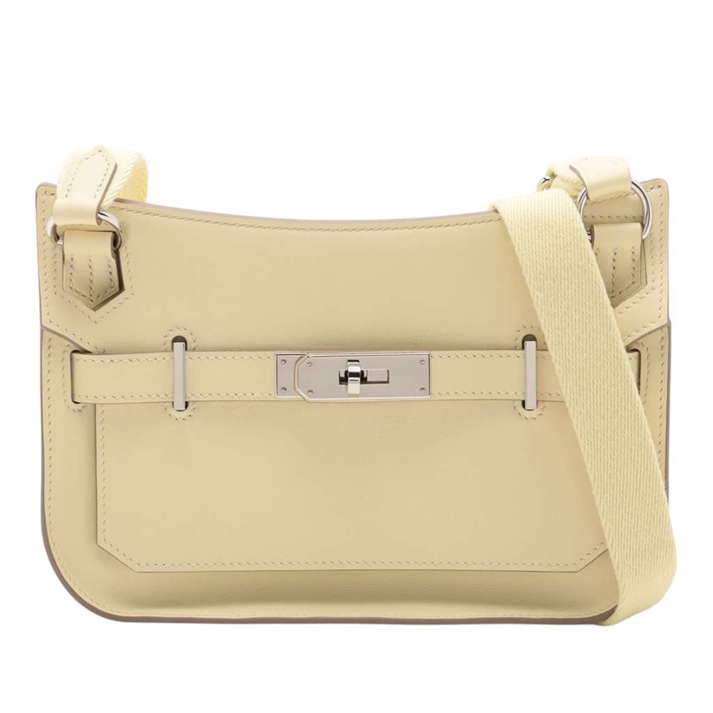 The Mini Jypsiere features a swift leather body, a flat adjustable strap, a front flap with belt and twist lock closure, and interior zip and slip pockets.