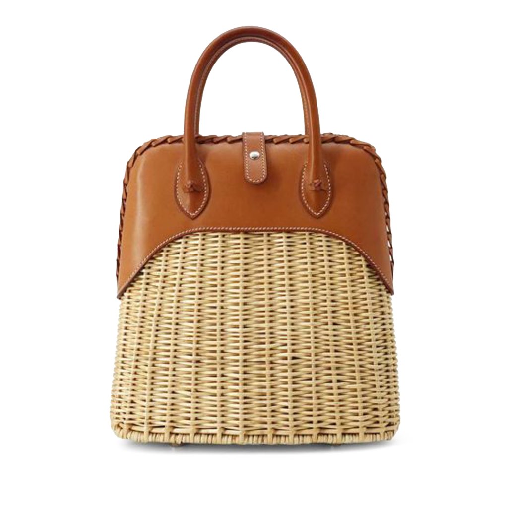 The Bolide Picnic features a Willow wicker and Fauve color Barenia leather body, rolled leather handles, a top strap with snap closure, and interior slip pockets.