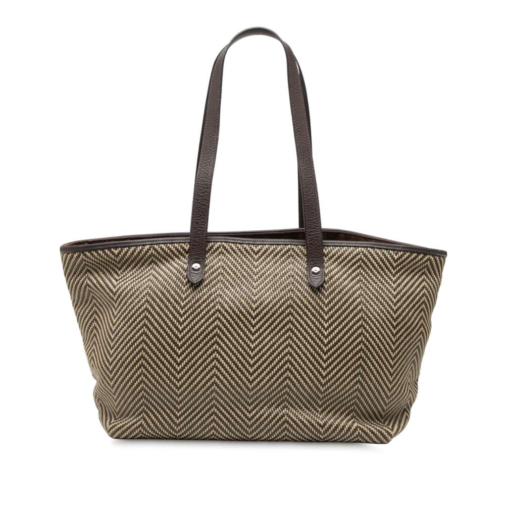 The Chennai PM features a woven polyester and leather body, flat leather straps, an open top, and an interior slip pocket.
