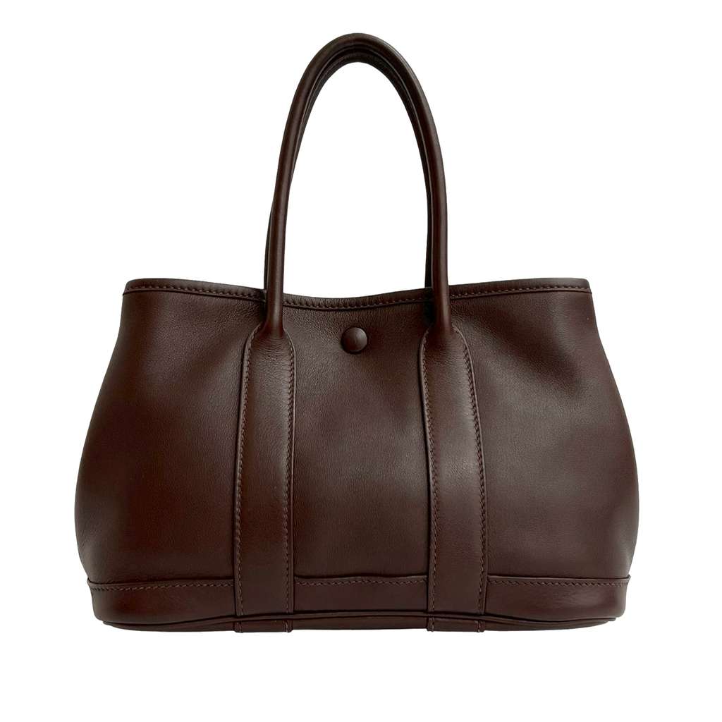 This Garden Party features a Swift leather body in Havane color, rolled leather handles, a top snap button closure, and a silk Bolduc Twilly scarf inclusion.