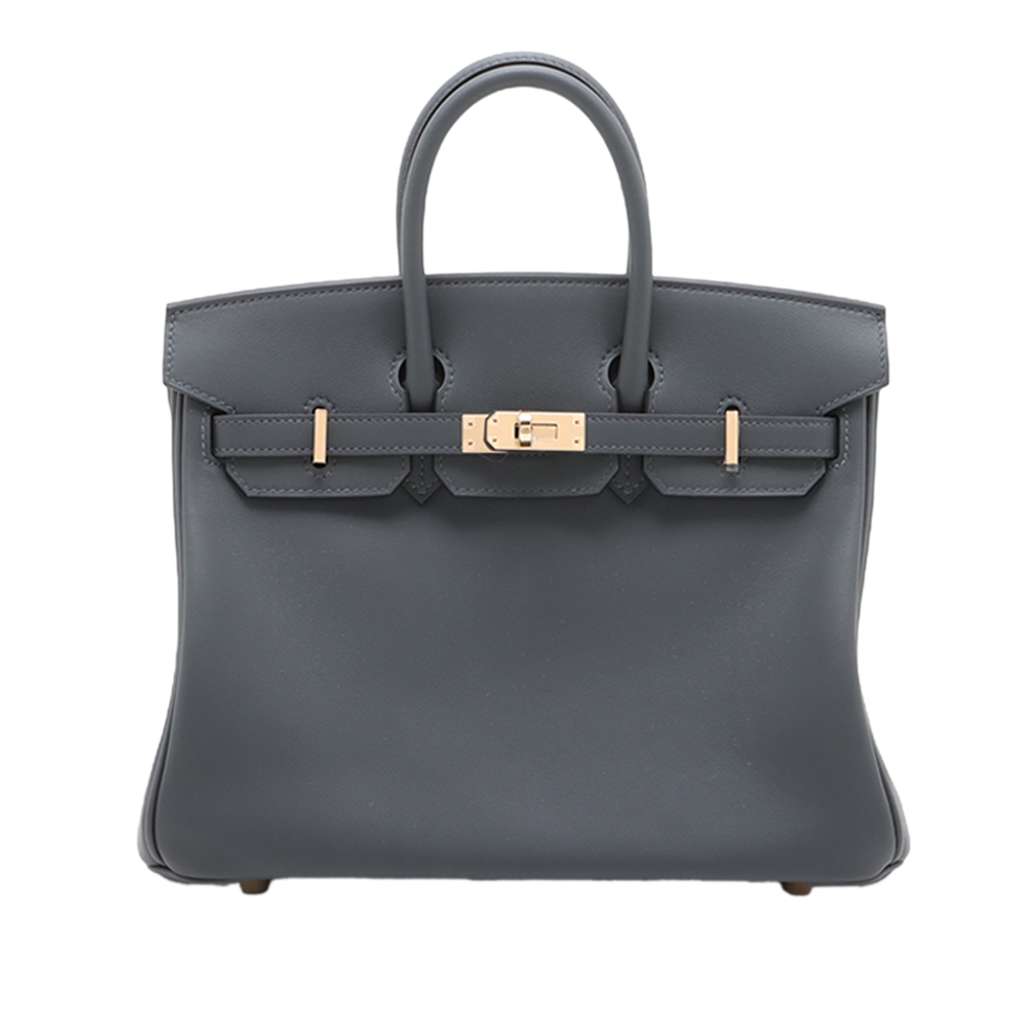 This Birkin 25 features a Swift leather body in Gris Misty color, rolled leather top handles, a front flap with turn lock closure, and interior zip and slip pockets.