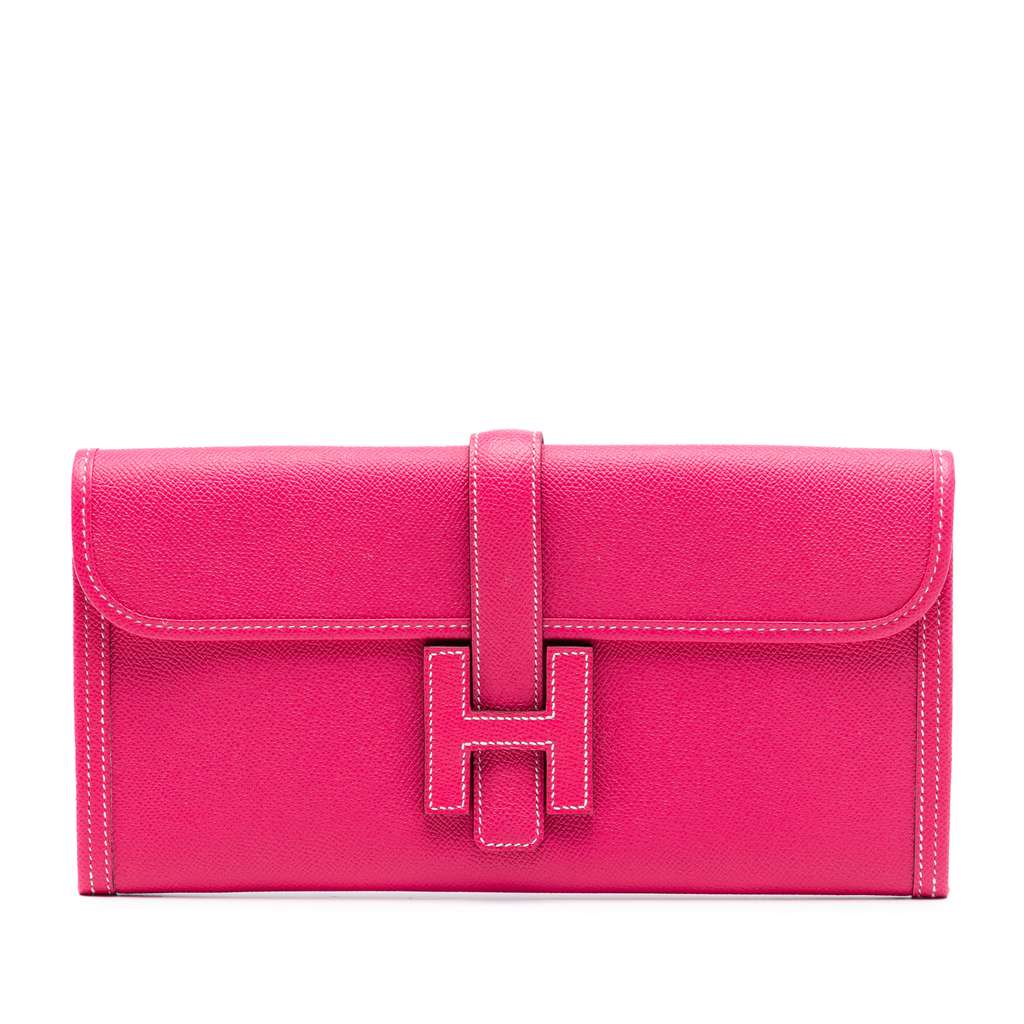 The Jige clutch bag features a Swift leather body in Rose Tyrien color and a front flap with a top strap.