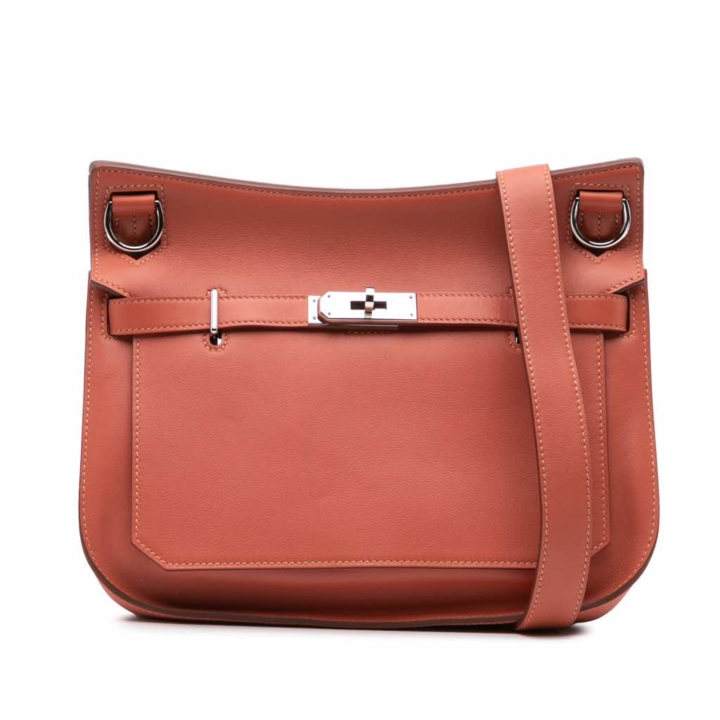 The Jypsiere 28 features a Swift leather body in Sanguine color, a removable flat leather strap, a front flap with a twist lock closure, and interior zip and slip pockets.