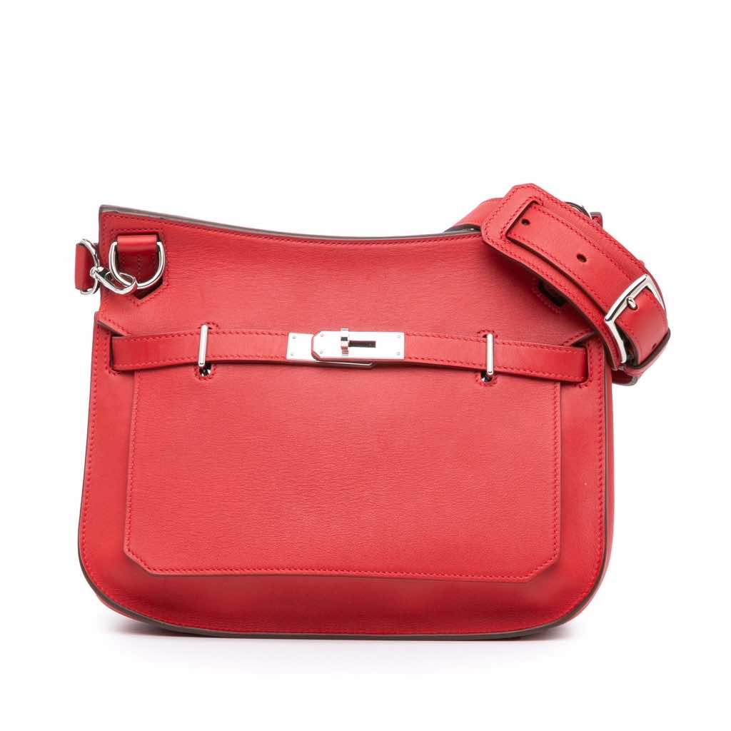 The Jypsiere 28 features a Swift leather body, a flat leather strap, a front flap with a twist lock closure, and interior zip and slip pockets.
