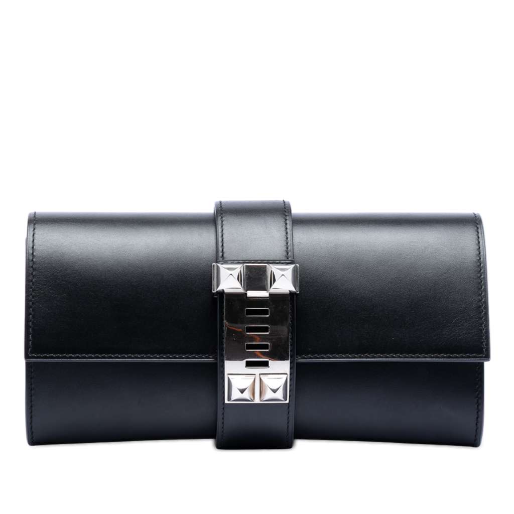 This clutch bag features a Tadelakt leather body in Noir color, a front flap closure, and an interior slip pocket.