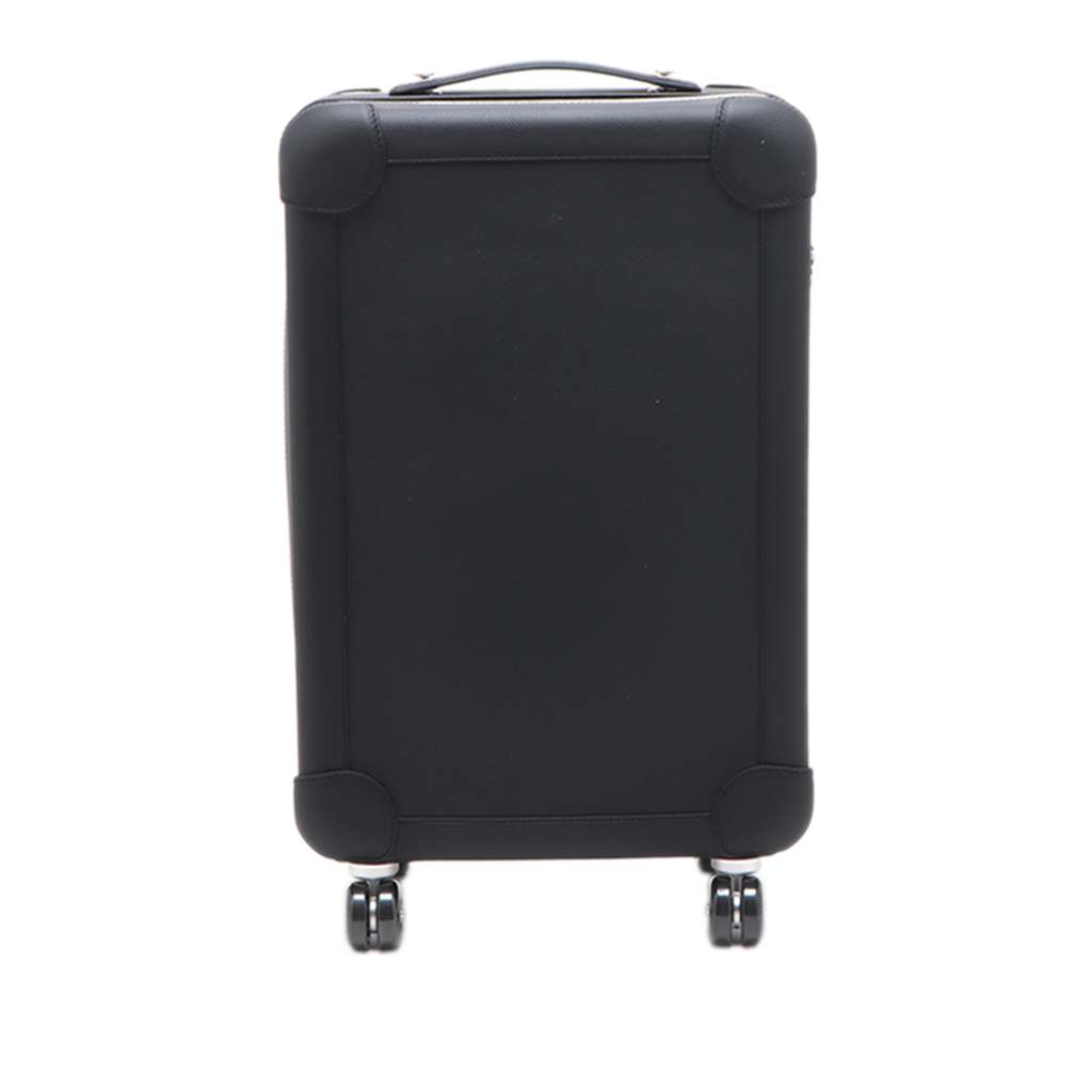 This travel bag features a Taurillon Regate leather body, a flat leather top handle, a retractable handle, trolley wheels, a zip around closure, an exterior back zip pocket, and interior zip compartments.