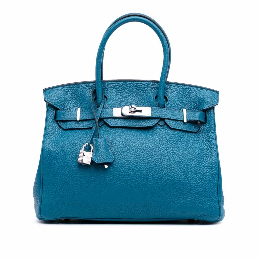 This Birkin 30 features a Togo leather body in Blue Izmir color, rolled leather handles, a front flap with a twist lock closure, and interior zip and slip pockets.