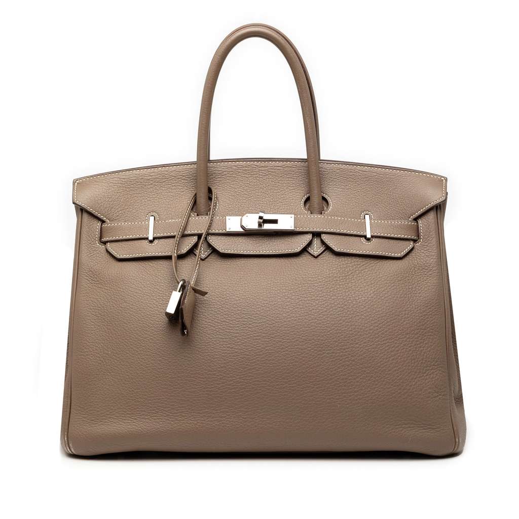 This Birkin 35 features a Togo leather body in Etoupe color, rolled leather handles, a front flap with turn-lock closure, and interior slip and zip pockets.