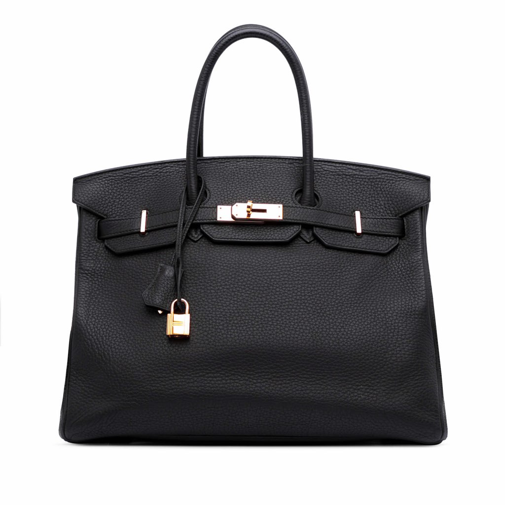 This Birkin 35 features a Togo leather body in Noir color, rolled leather handles, a front flap with turn-lock closure, and interior slip and zip pockets.