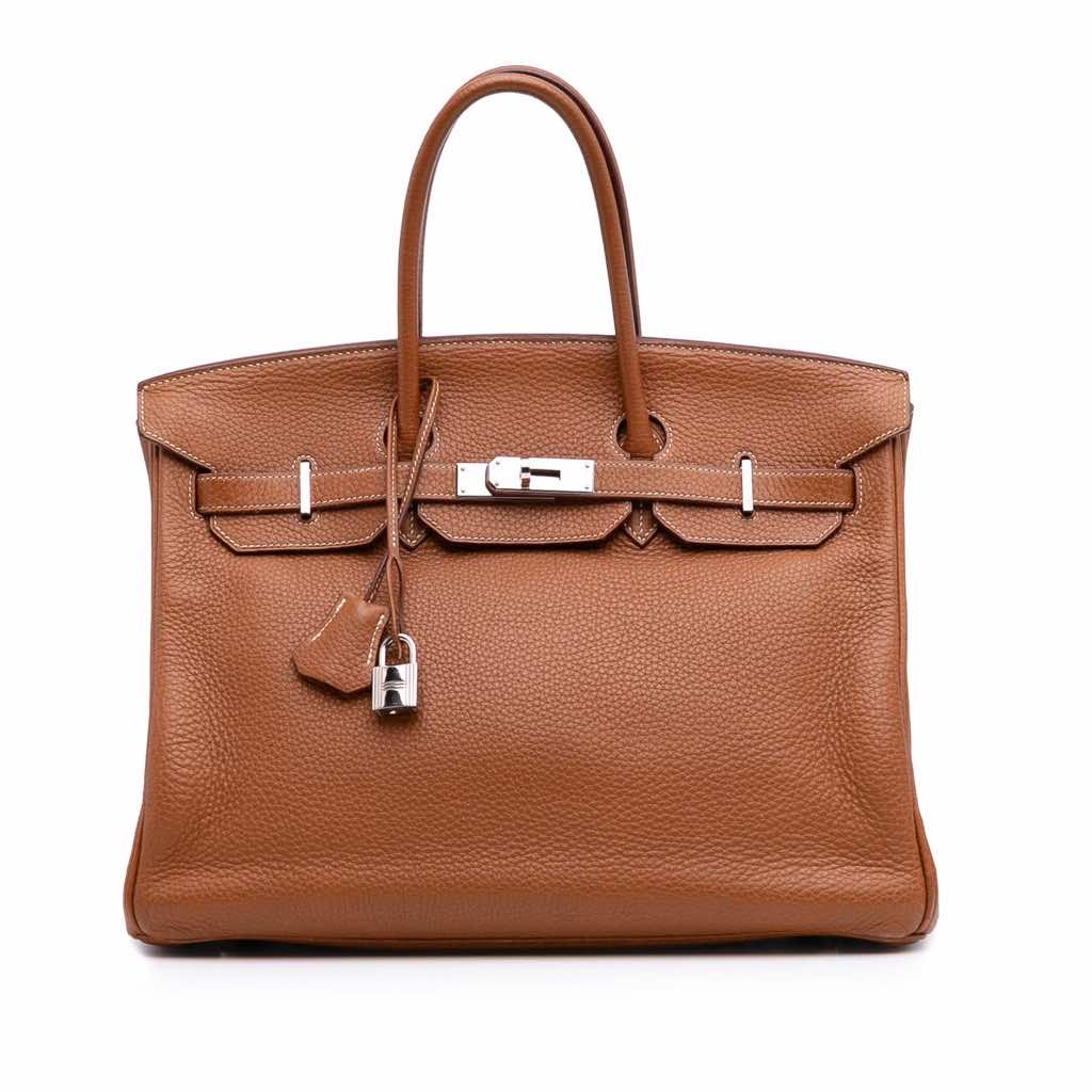The Birkin 35 features a Togo leather body in Gold color, rolled leather handles, a front flap with turn-lock closure, and interior open and zip pockets.