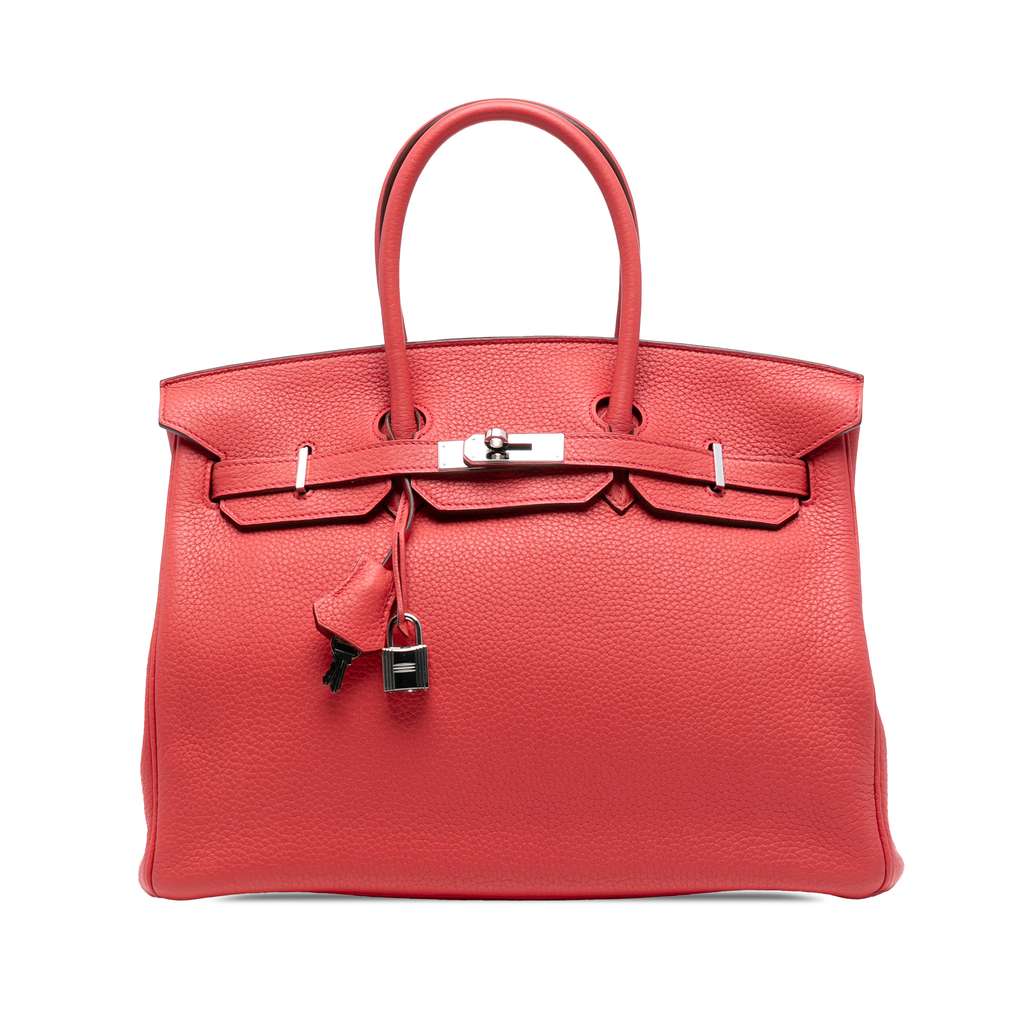 This Birkin 35 features a Togo leather body in Rouge Casaque color, rolled leather handles, a front flap with a strap and turn lock closure, and interior zip and slip pockets.