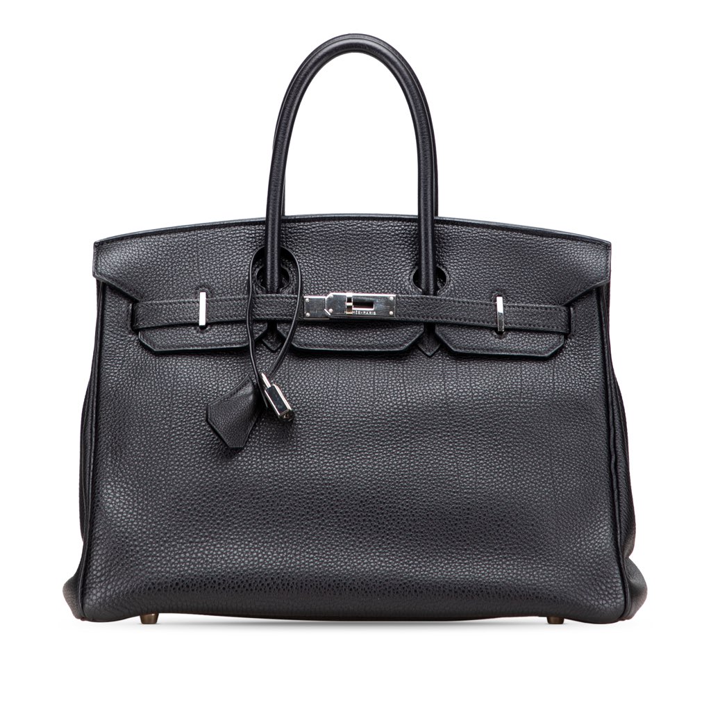 This Birkin 35 features a Togo leather body in Noir color, rolled leather handles, a front flap with turn-lock closure, and interior zip and slip pockets.