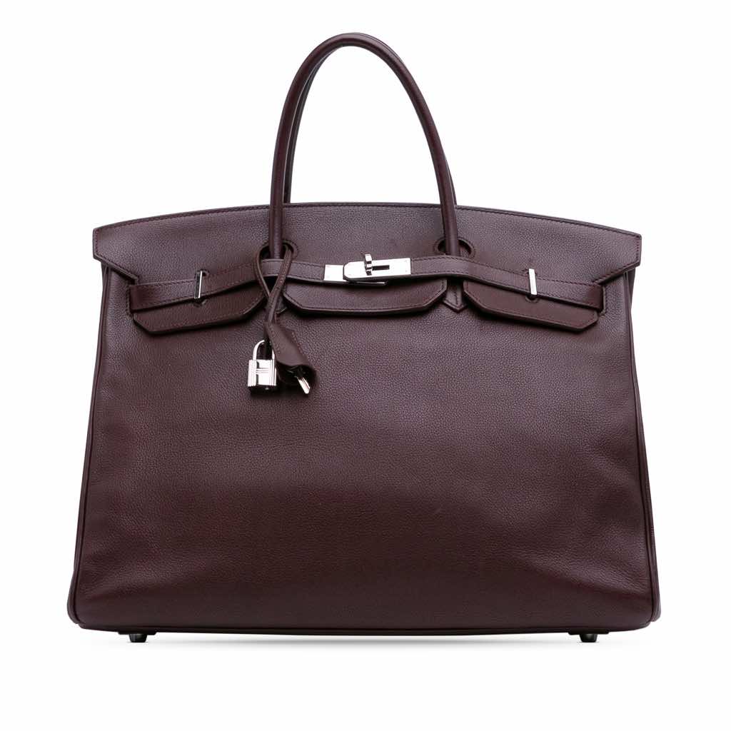 This Birkin 40 features a Togo leather body in Havane color, rolled leather handles, a front flap with a twist lock closure, and interior zip and slip pockets.