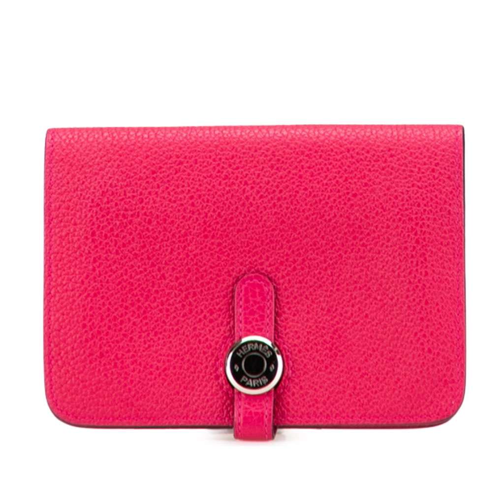 The Dogon wallet features a calf leather body, a front leather tab and pull through closure, an interior zip compartment, and interior card slots.