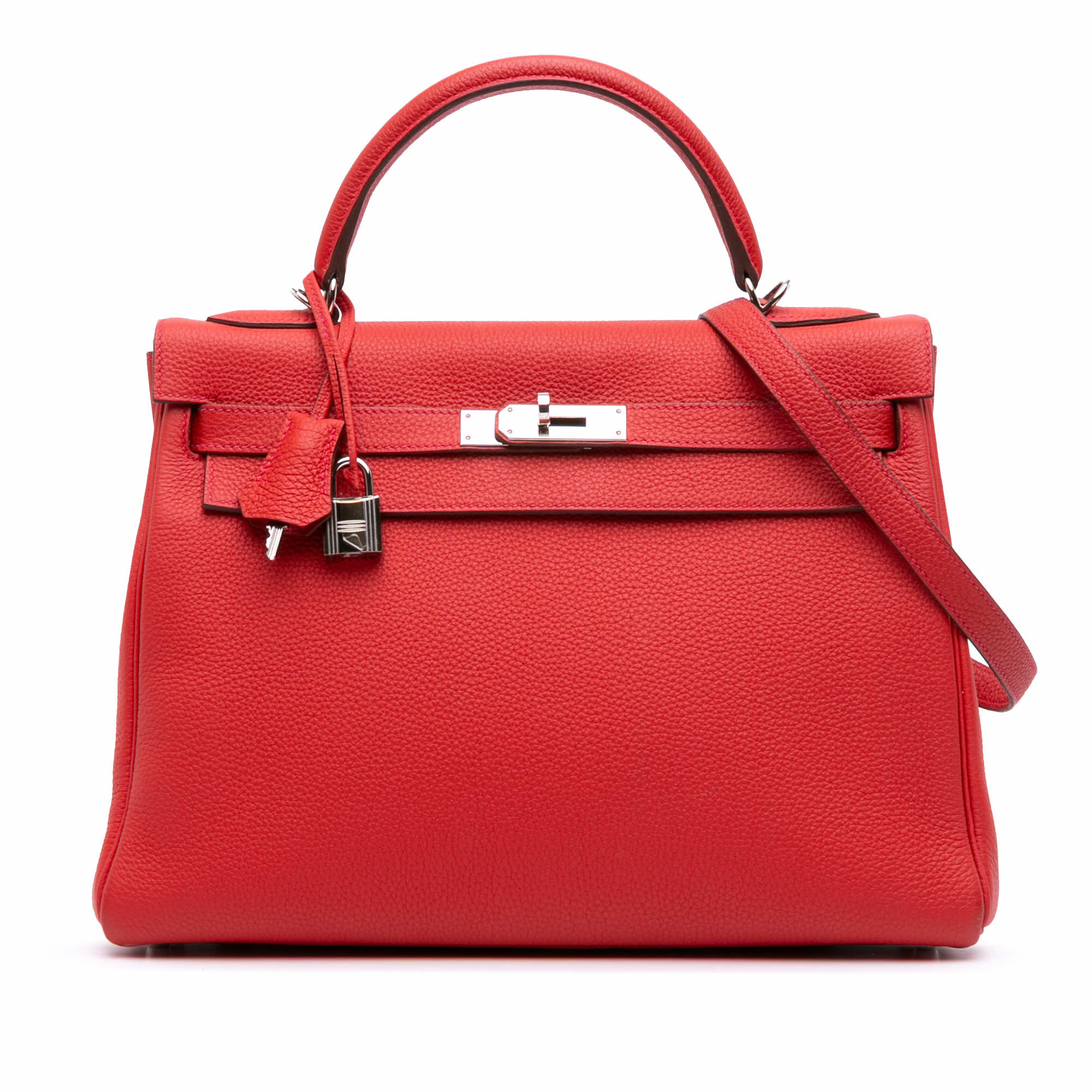 This Kelly 32 features a Togo leather body in Rouge Casaque color, a flat leather top handle, a detachable flat leather strap, a top flap with twist lock closure, and interior zip and slip pockets.
