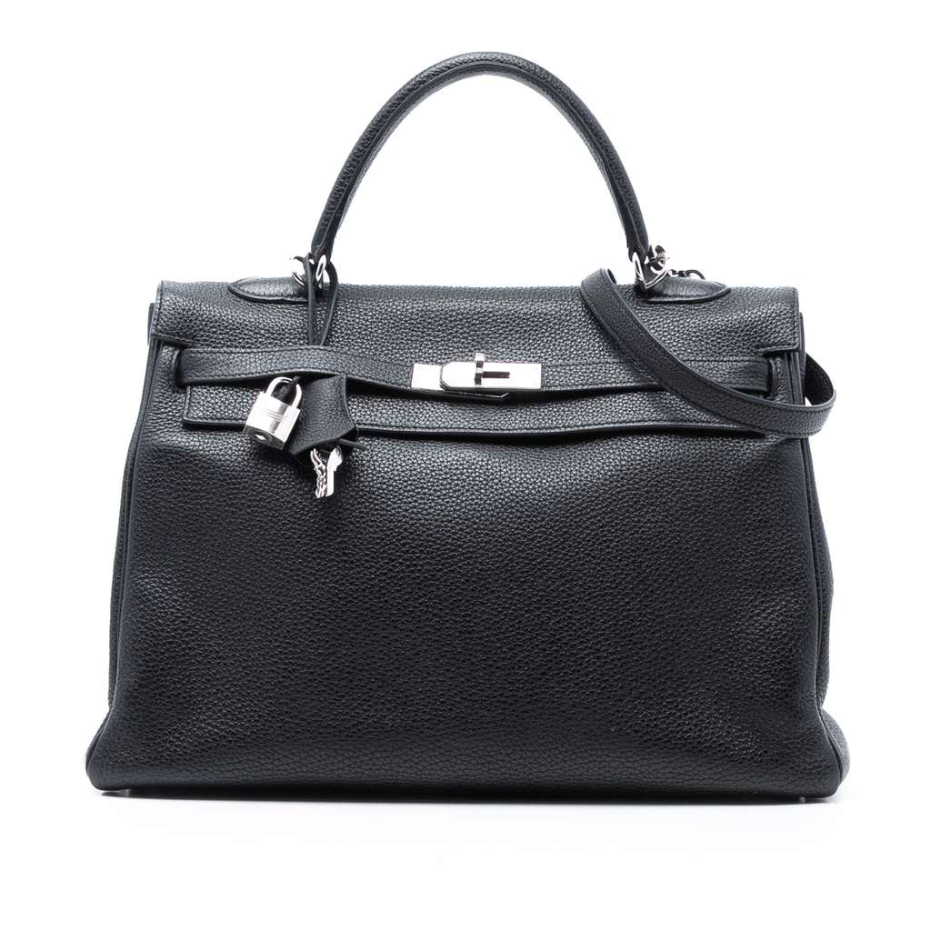 This Kelly 35 features a Togo leather body in Noir color, a flat leather top handle, a detachable flat strap, a front flap with twist lock closure, and interior zip and slip pockets.
