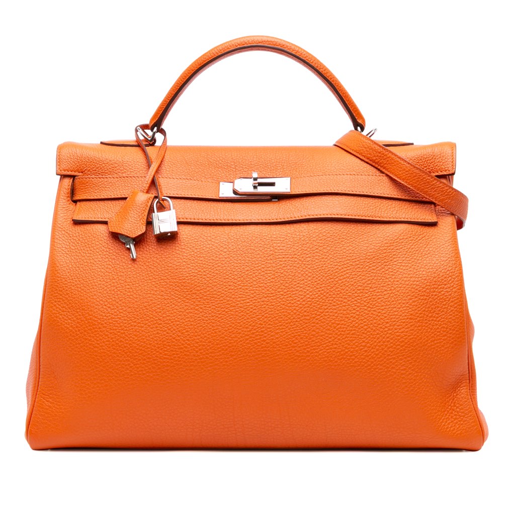 This Kelly 40 features a Togo leather body in Orange color, a rolled leather top handle, a detachable flat leather strap, a front flap with turn lock closure, and interior zip and slip pockets.