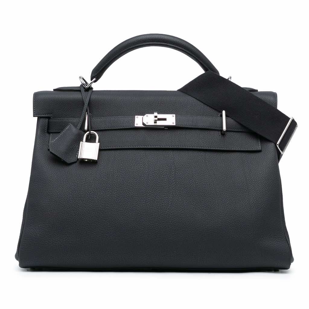 The Maxi Kelly 42 features a togo leather body, a rolled leather top handle, a flap with pull through and turn lock closure, an exterior back zip pocket, and interior zip and slip pockets.