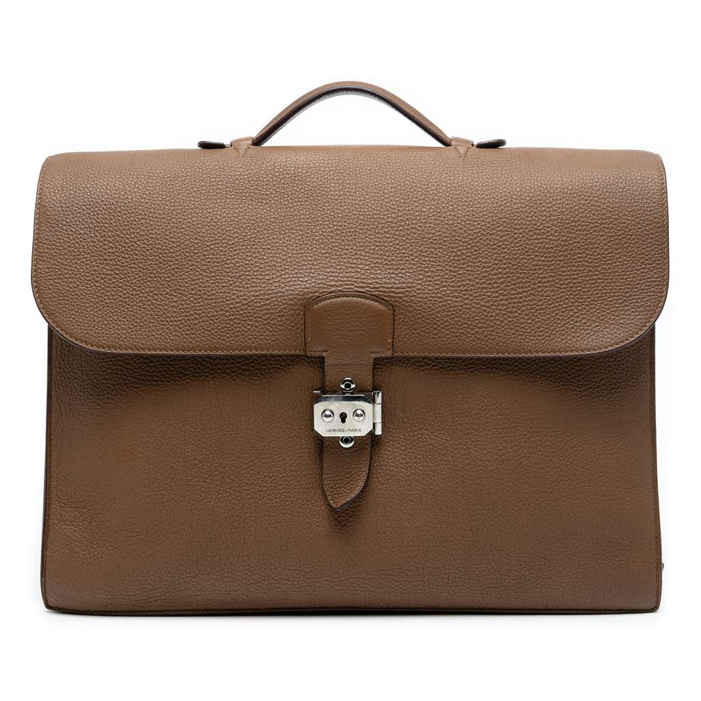 This Sac a Depeches features a Togo leather body in Alezan color, a flat leather top handle, a front flap with flip-lock closure, an exterior back slip pocket, interior open compartments, and interior slip pockets. Exterior sides are repainted.
