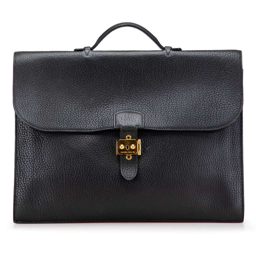 The Sac a Depeches features a togo leather body in Noir color, a flat leather top handle, a front flap with flip-lock closure, interior compartments, and interior slip pockets.