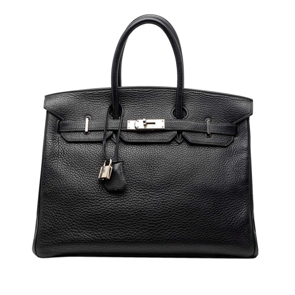 This Birkin 35 features a Togo leather body in Noir color, an interior in Blue Nuit color, rolled leather handles, a front flap with turn-lock closure, and interior zip and slip pockets.